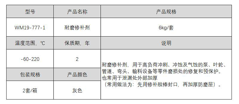 ·耐磨修补剂,用于高负荷冲刷、冲蚀及气蚀的泵、叶轮、管道、弯头、输料设备等零件磨损处的修复和预保护。 ·也常用于泄漏处外部加厚(常用做法为:先用修补胶棒封口,再加厚防磨层)。