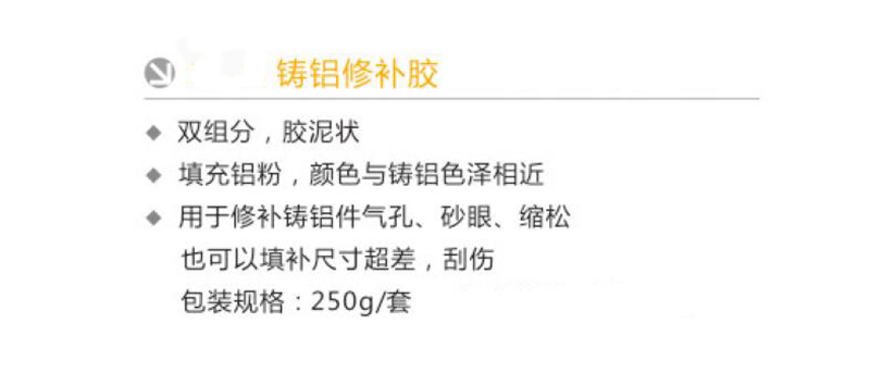 ·双组分,胶泥状 ·填充铝粉,颜色与铸铝色泽相近 ·用于修补铸铝件气孔、砂眼、缩松也可以填补尺寸超差,刮伤 ·包装规格:250g/套