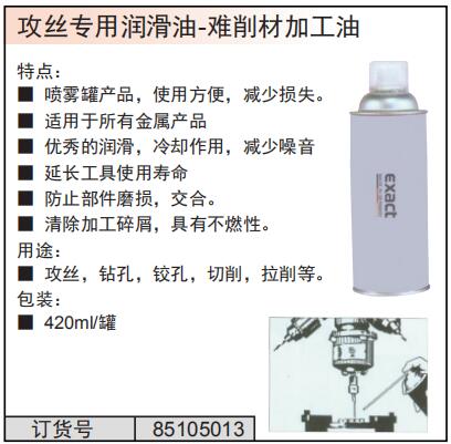 ·喷雾罐产品,使用方便,减少损失。 ·适用于所有金属产品 ·优秀的润滑,冷却作用,减少噪音 ·延长工具使用寿命 ·防止部件磨损,交合。 ·清除加工碎屑,具有不燃性。 ·420ml/罐