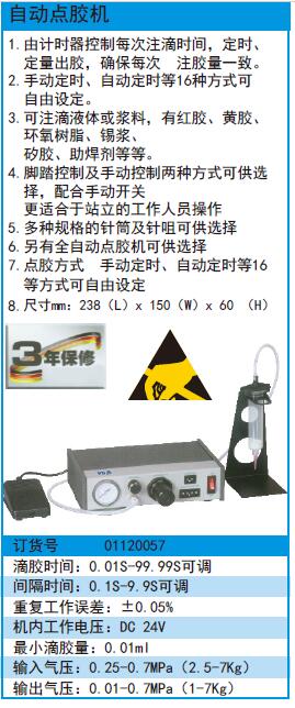 ·由计时器控制每次注滴时间,定时、定量出胶,确保每次 注胶量一致。 ·手动定时、自动定时等16种方式可自由设定。 ·可注滴液体或浆料,有红胶、黄胶、环氧树脂、锡浆、硅胶、助焊剂等等。 ·脚踏控制及手动控制两种方式可供选择,配合手动开关更适合于站立的工作人员操作 ·多种规格的针筒及针咀可供选择 ·另有全自动点胶机可供选择 ·点胶方式 手动定时、自动定时等16等方式可自由设定 ·尺寸mm:238(L)x 150(W)x 60 (H)