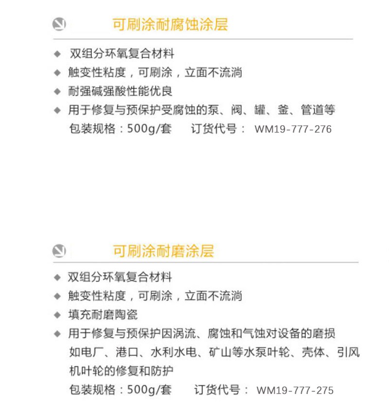 ·双组分环氧复合材料 ·触变性粘度,可刷涂,,立面不流淌 ·填充耐磨陶瓷 ·用于修复与预保护因涡流、腐蚀和气蚀对设备的磨损如电厂、港口、水利水电、矿山等水泵叶轮、壳体、引风机叶轮的修复和防护 ·包装规格: