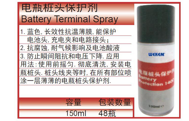 ·蓝色,长效性抗温薄膜,能保护电池头,充电夹和电路接头; ·抗腐蚀,耐气候影响及电池酸液 ·防止瞬间阻抗和电压下降.应用 ·用法:使用前摇匀.彻底清洗,安装电瓶桩头.桩头线夹等时,在所有部位喷涂一层薄薄的电瓶桩头保护剂.