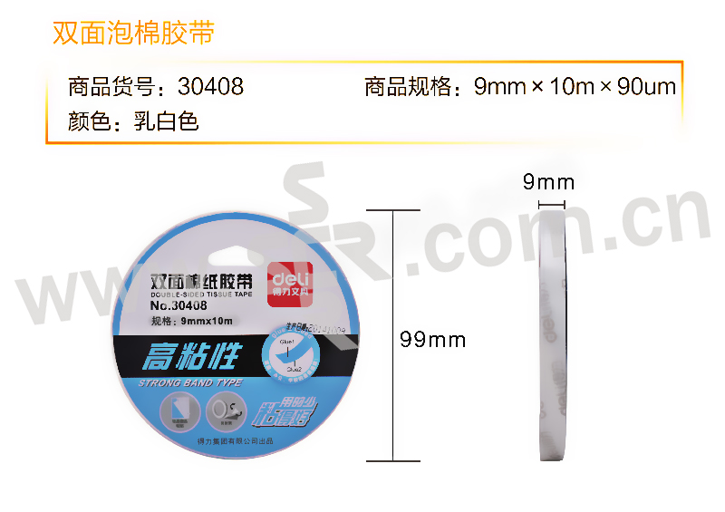 DELI/得力 油性双面胶带 30408 10m×9mm 乳白色 1卷