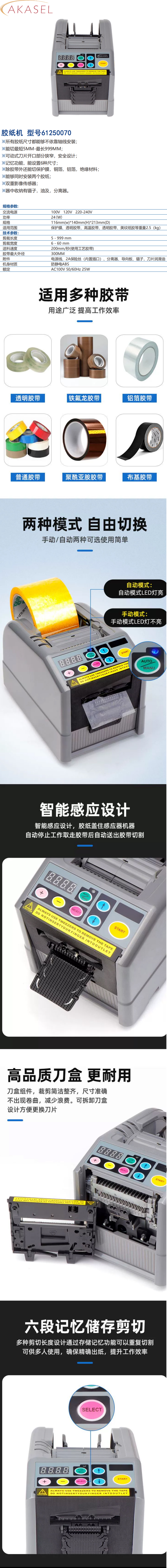 ·所有胶纸尺寸都能够不依靠轴线安装; ·能切最短5MM-最长999MM; ·可动式刀片开口部分狭窄,安全设计; ·记忆功能,能设置6种尺寸;·除胶带外还能切保护膜,铜箔,铝箔,绝缘材料; ·能够同时安装两个胶纸; ·双重影像传感器; ·器中收纳有镊子,油及,分离器。