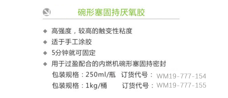 ·高强度,较高的触变性粘度 ·适于手工涂胶 ·5分钟就可固定 ·用于过盈配合的内燃机碗形塞固持密封