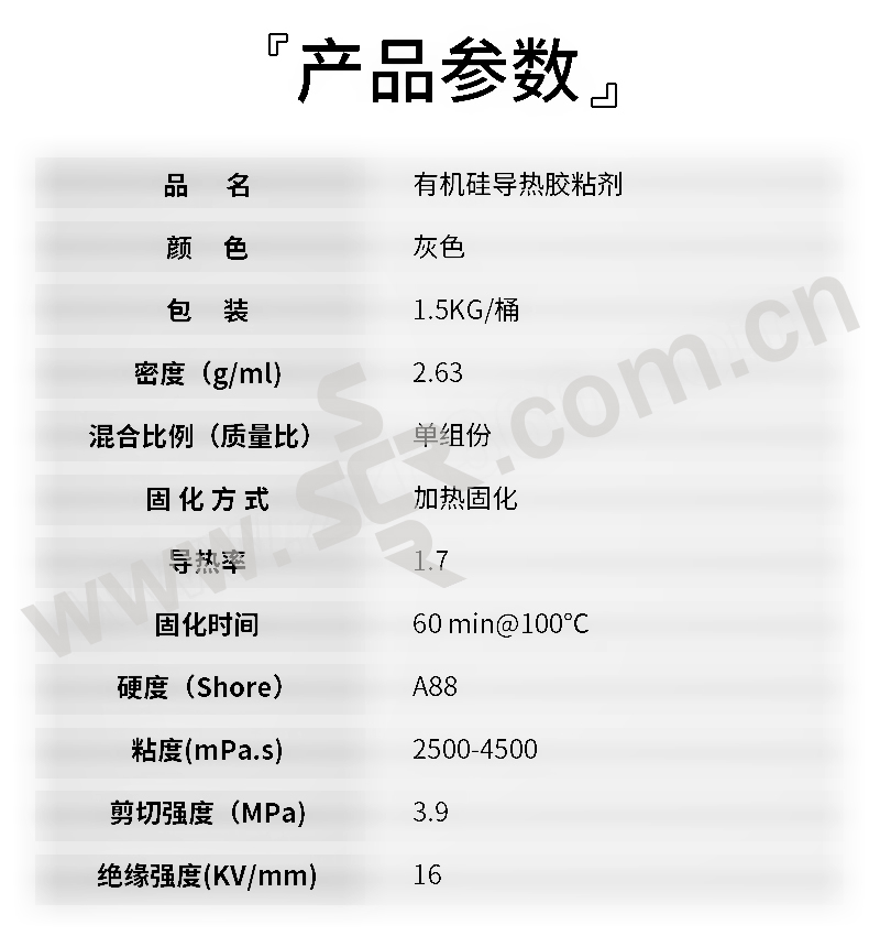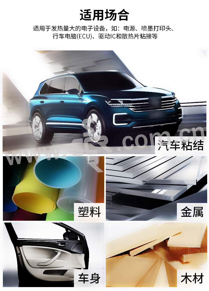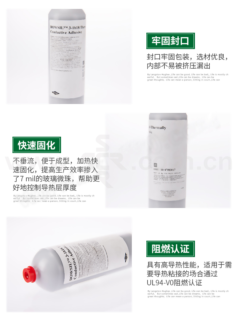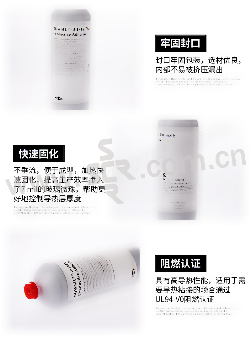 ·高触变性:不垂流,便于成型。 ·加热固化:加热快速固化,提高生产效率。 ·高导热性:具有高导热性能,适用于需要导热粘接的场合。 ·阻燃性能:通过UL94-V0阻燃认证。 ·厚度控制:掺入了7 mil的玻璃微珠,帮助更好地控制导热层厚度。