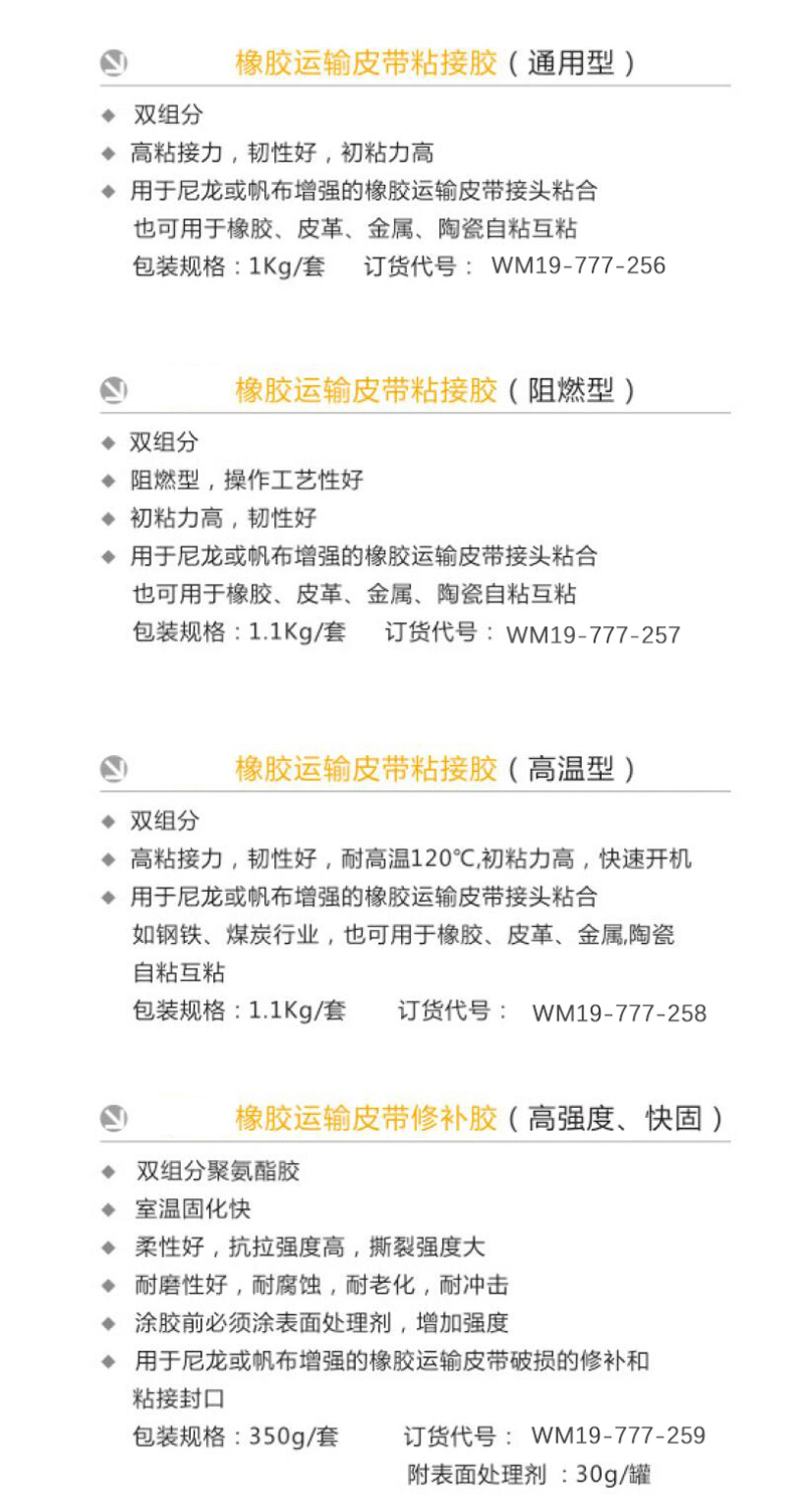 ·双组分 ·高粘接力,韧性好﹐耐高温120℃,初粘力高,快速开机 ·用于尼龙或帆布增强的橡胶运输皮带接头粘合 ·如钢铁.煤炭行业,也可用于橡胶.皮革、金属,陶瓷自粘互粘