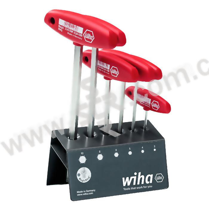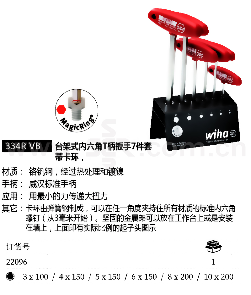 ·材质:铬钒钢,经过热处理和镀镍·手柄:威汉标准手柄,用小的力传递大扭力·卡环由弹簧钢制成,可以在任一角度夹持住所有材质的标准内六角螺钉(从3毫米开始)。·坚固的金属架可以放在工作台上或是安装在墙上,上面印有实际比例的起子头图示