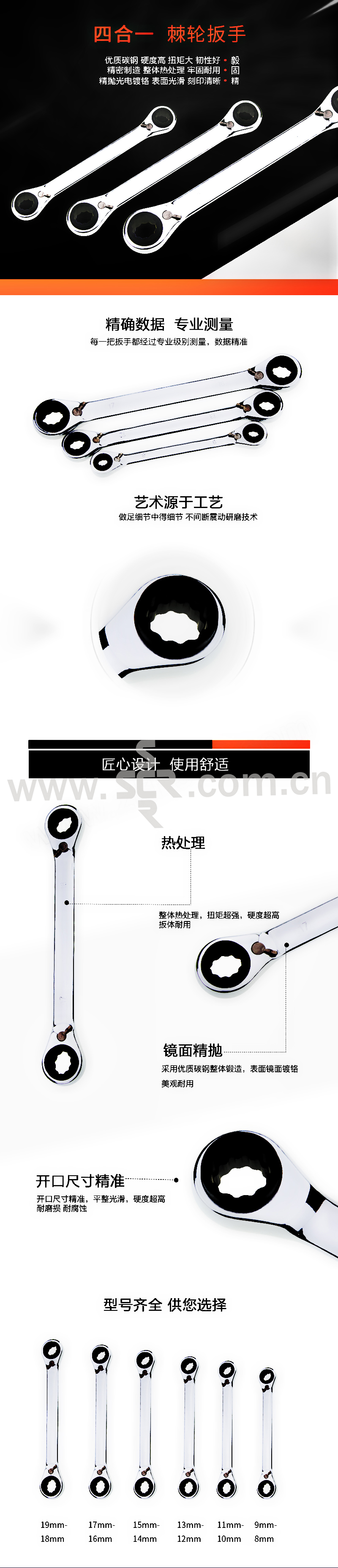 ·扳体采用优质铬钒钢材料整体锻打成型,强度高。·整体网带炉热处理,硬度高。·棘轮组件采用铬钼合金钢精密加工,咬合精准,扭力更大。铬钼钢耐磨效果好,使用寿命长。·72齿棘轮,使用更灵活,仅需5度空间。带换向拔片,操作更方便。·每个梅花端特有的高计,可对应2个规格的螺栓,一把扳手可以满足4个规格螺栓的松紧工作。·表面镜面抛光,电镀铬,美观,防锈效果好。
