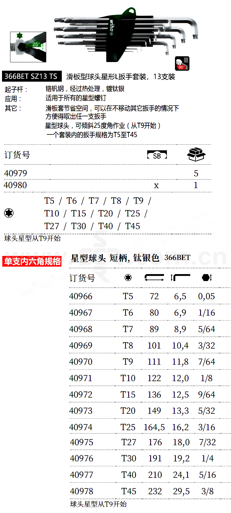 WIHA/威汉 滑盖式钛银色球头星形L扳手套装 40980 SB 366BETSZ13TS 吸塑包装 13件 1套