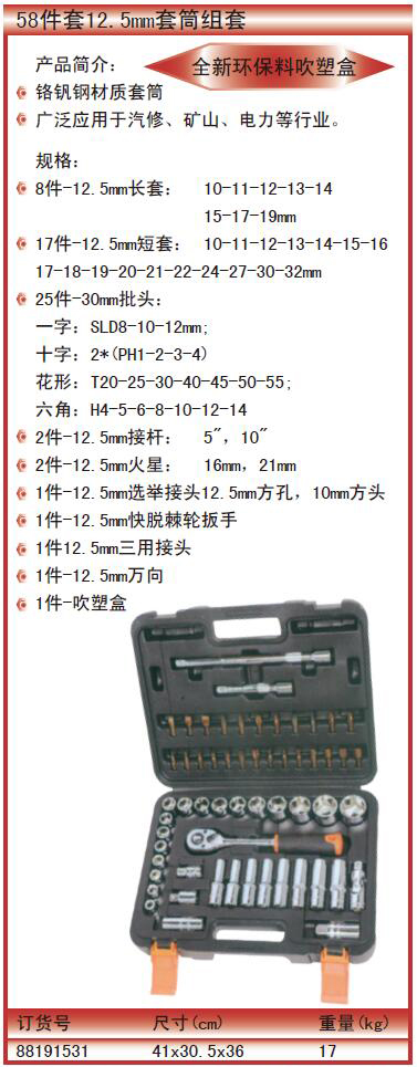 ·8件-12.5mm长套:10-11-12-13-14 ·15-17-19mm ·17件-12.5mm短套:10-11-12-13-14-15-16 ·17-18-19-20-21-22-24-27-30-32mm ·25件-30mm批头: ·一字:SLD8-10-12mm; ·十字:2*(PH1-2-3-4) ·花形:T20-25-30-40-45-50-55; ·六角:H4-5-6-8-10-12-14 ·2件-12.5mm接杆:5",10" ·2件-12.5mm火星:16mm,21mm ·1件-12