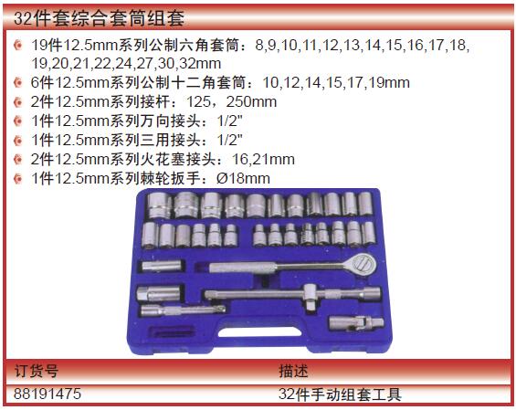 ·19件12.5mm系列公制六角套筒:8,9,10,11,12,13,14,15,16,17,18,19,20,21,22,24,27,30,32mm ·6件12.5mm系列公制十二角套筒:10,12,14,15,17,19mm ·2件12.5mm系列接杆:125,250mm ·1件12.5mm系列万向接头:1/2" ·1件12.5mm系列三用接头:1/2" ·2件12.5mm系列火花塞接头:16,21mm ·1件12.5mm系列棘轮扳手:Ø18mm