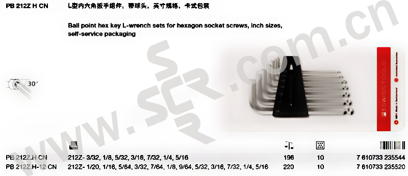 PB/瑞士PB 212ZH-CN系列英制L型球头内六角扳手组件 PB 212Z.H CN 7件(3/32"--5/16") 1套