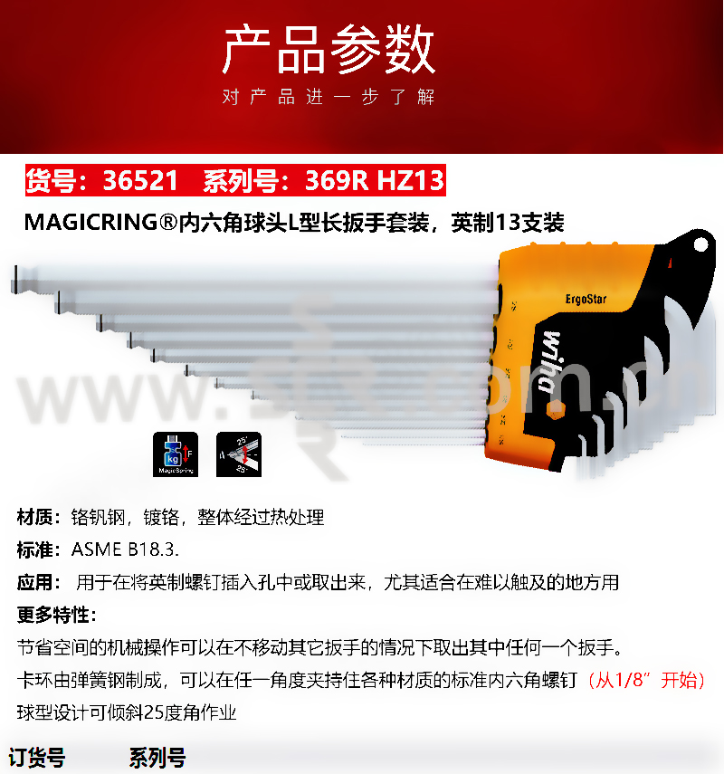 WIHA/威汉 英制球头带卡环L型内六角扳手组套 36521 369R HZ13 带墙体托架 13件 1套
