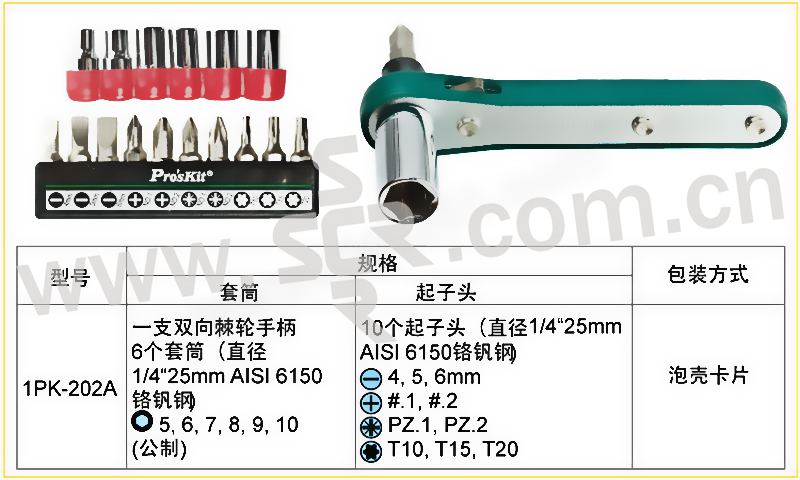 PROSKIT/宝工 1/4"系列直匣式棘轮替换扳手组(公制) 1PK-202A 16合1 5-10mm和SL4-6mm/PH1-2/PZ1-2/T10-T20 1套