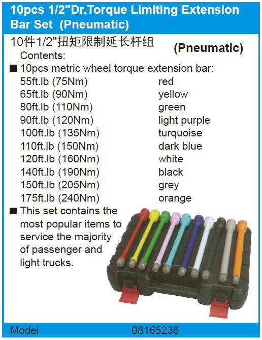 英文名称:  10pcs 1/2"Dr.Torque Limiting Extension Bar Set (Pneumatic)