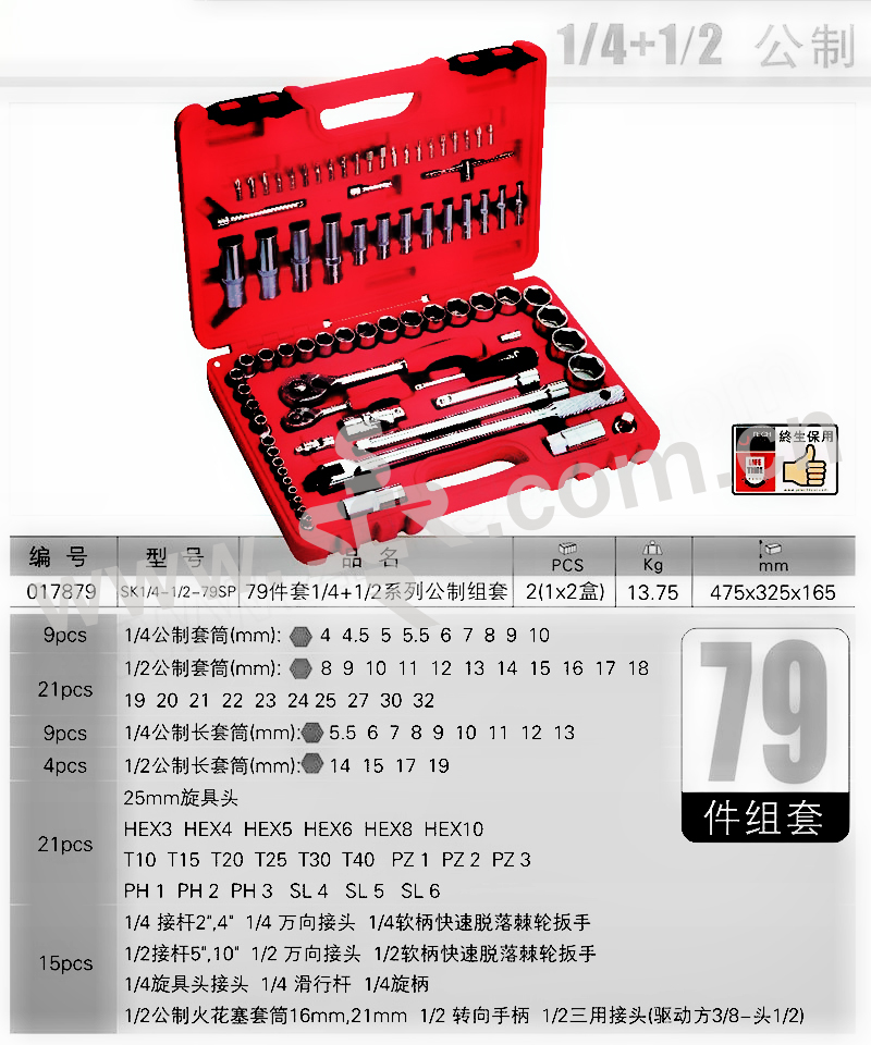JETECH/捷科 1/4"×1/2"系列公制套筒套装(79件)吹塑盒 SK1/4-1/2-79SP 79件 4-32mm 1套