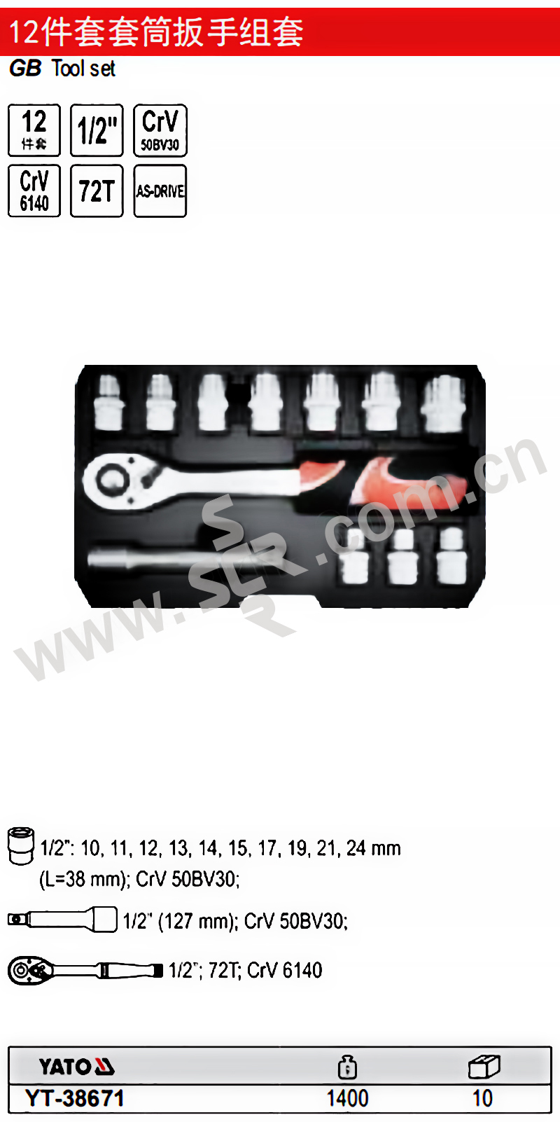YATO/易尔拓 12.5MM系列套筒扳手组套(12件) YT-38671 12件 10-24mm 1套