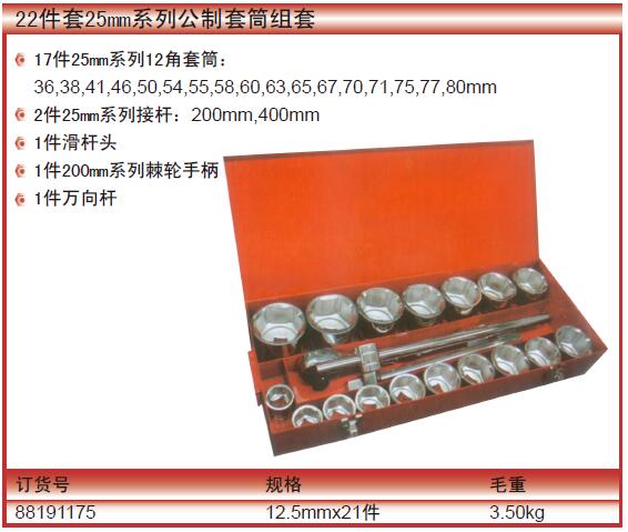 ·17件25mm系列12角套筒:36,38,41,46,50,54,55,58,60,63,65,67,70,71,75,77,80mm ·2件25mm系列接杆:200mm,400mm ·1件滑杆头 ·1件200mm系列棘轮手柄 ·1件万向杆