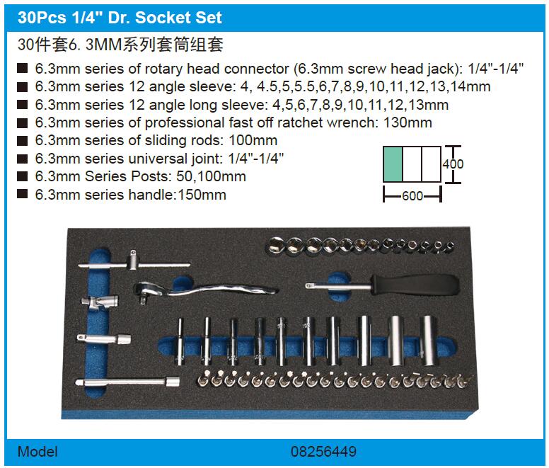 08256449 KT8-256-449 30件 6.3mm系列旋转头连接器(6.3mm螺丝头插孔): 1/4“ -1/4” 6.3mm系列12角套筒: 4 4.5 5 5.5 6 7 8 9 10 11 12 13 14mm 6.3mm系列12角长套筒: 4 5 6 7 8 9 10 11 12 13mm 6.3mm系列专业快速棘轮扳手: 130mm 6.3mm系列滑杆: 100mm 6.3毫米系列万向节: 1/4“-1/4” 6.3mm系列接杆: 50 100mm 6.3mm系列手柄: 150mm 1016.16