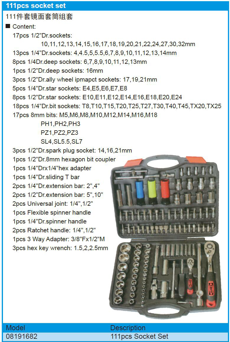 08191682 KT8-191-682 111件 7pcs 1/2“.sockets: 10 11 12 13 14 15 16 17 18 19 20 21 22 24 27 30 32mm 13个1/4"插座: 4 4.5 5 5.5 6 7 8 9 10 11 12 13 14mm 8pcs 1/4Dr.deep插座: 6 7 8 9 10 11 12 13mm 1个1/2"Dr.star插座: 16mm 3个1/2"Dr.ally轮ipmapct插座: 17 19 21mm 5个1/4"Dr.star星形插座: E4 E5 E6 E7 E8 8 2508.00
