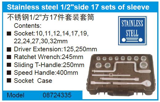 套筒:10,11,12,14,17,19,22,24,27,30,32mm 驱动扩展:125,250mm 棘轮扳手:245mm 滑动T型手柄:250mm 速度手柄:400mm 套筒盒