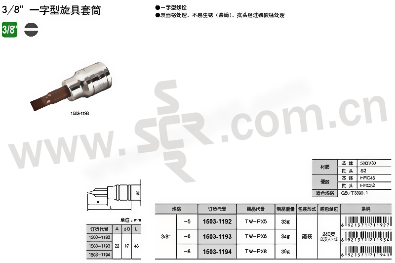 TAJIMA/田岛 3/8"系列一字型旋具套筒 1503-1192 5mm 1支