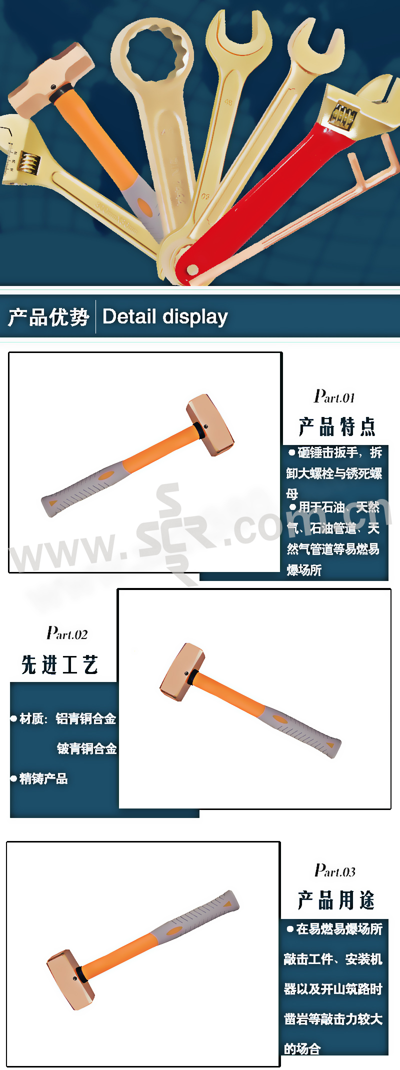 ·在易燃易爆场所敲击工件、安装机器以及开山、建路时凿岩、碎石等敲击力较大的场合。砸锤击扳手,拆卸大螺栓与锈死螺母。