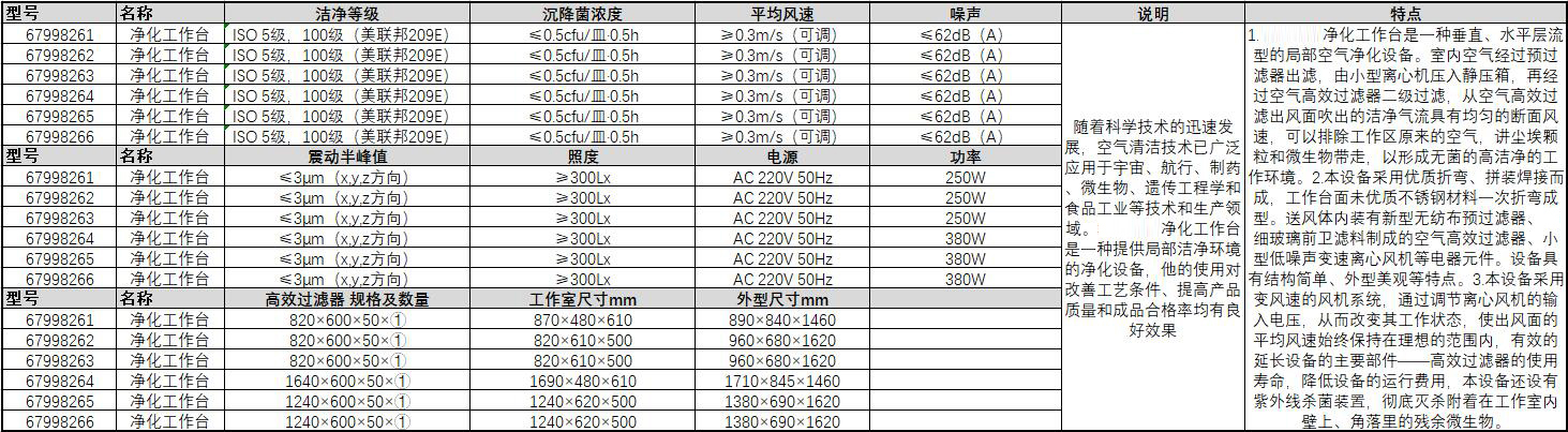 订货号 制造商型号 长度 宽度 高度 材质 适用品牌-型号 颜色 洁净等级 沉降菌浓度 平均风速 噪声 震动半峰值 照度 电源 功率 高效过滤器 规格及数量 工作室尺寸 价格 购物车