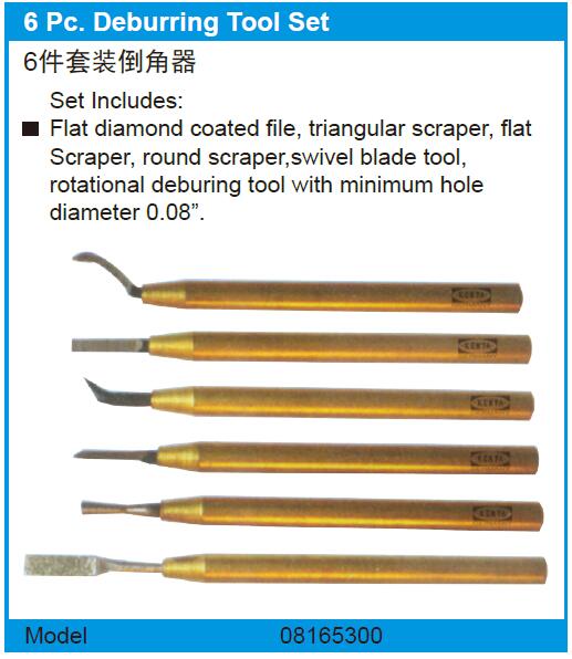 套装包括: 平面金刚石涂层锉刀,三角形刮刀,平面刮板,圆形刮板,旋转刀片工具,最小孔旋转去毛刺工具