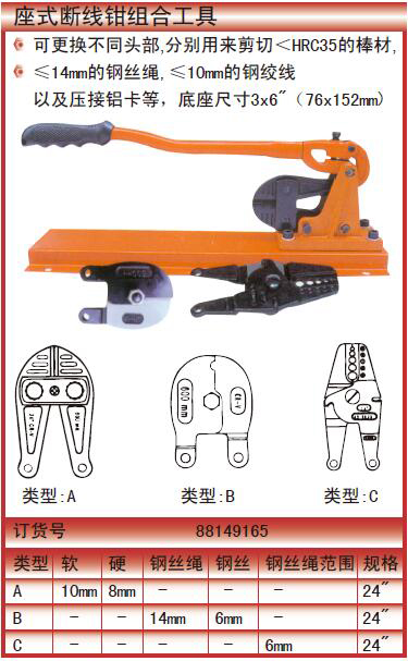 ·可更换不同头部,分别用来剪切<HRC35的棒材, ·≤14mm的钢丝绳,≤10mm的钢绞线 ·以及压接铝卡等,底座尺寸3×6"(76×152mm)