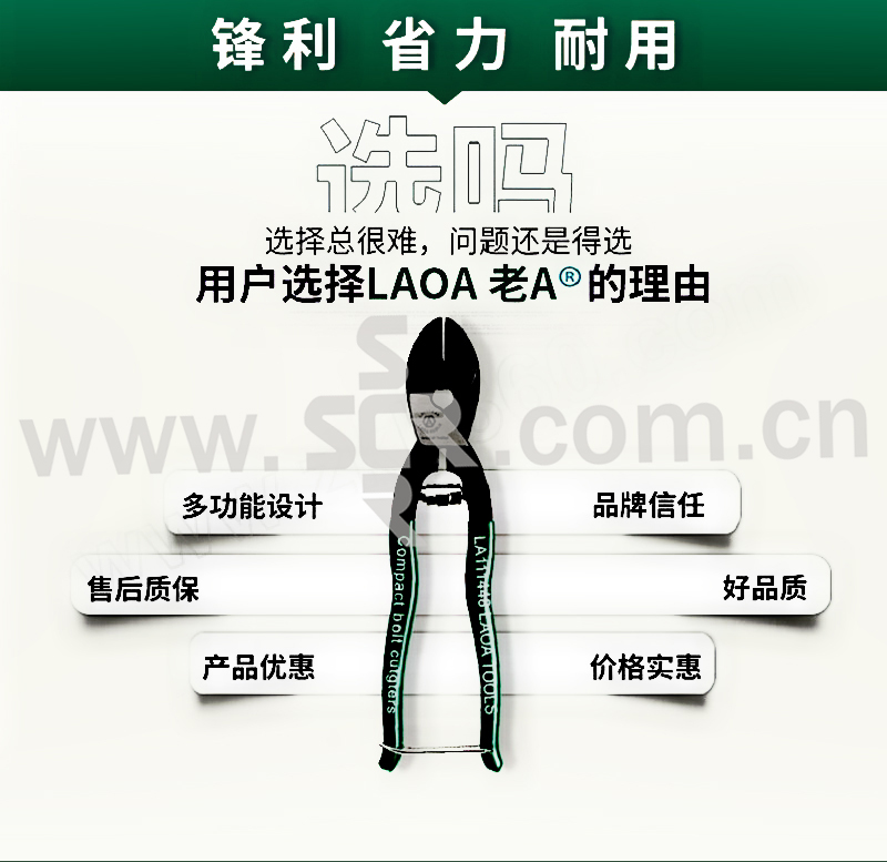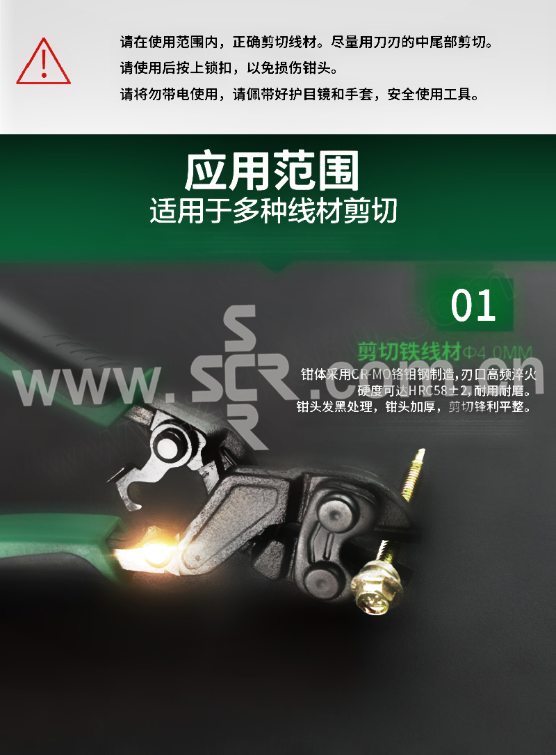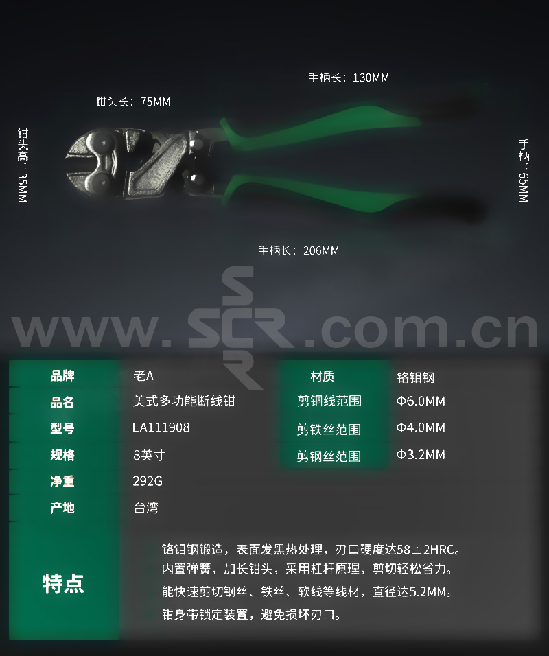 ·铬钼钢制造,高频淬火,硬度高,耐磨耐用,剪切能力强,握感舒适。