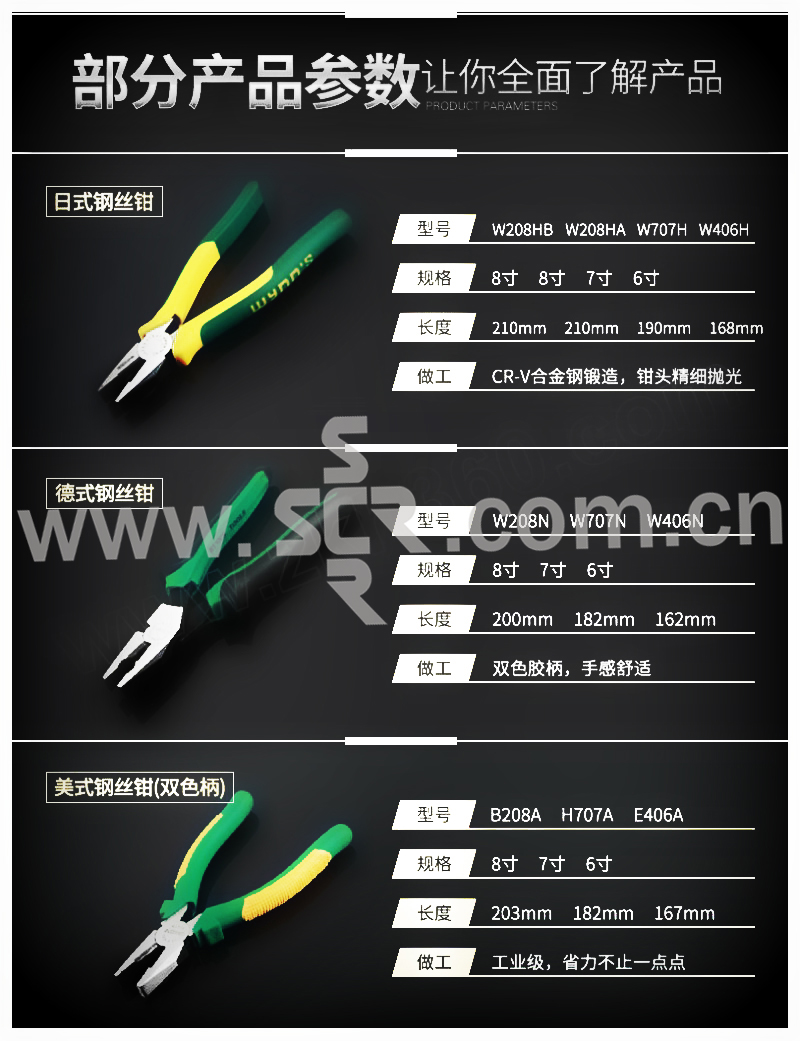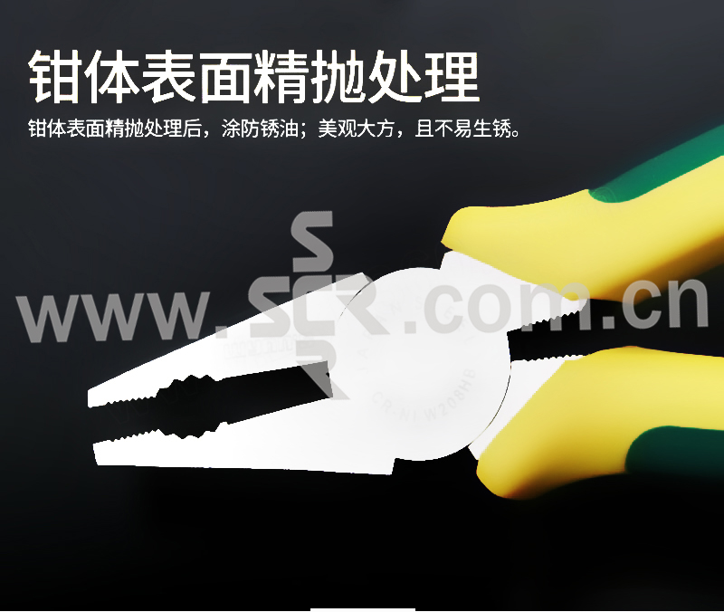 ·刃口经高频淬火处理,剪切锋利;钳头发黑精磨处理。