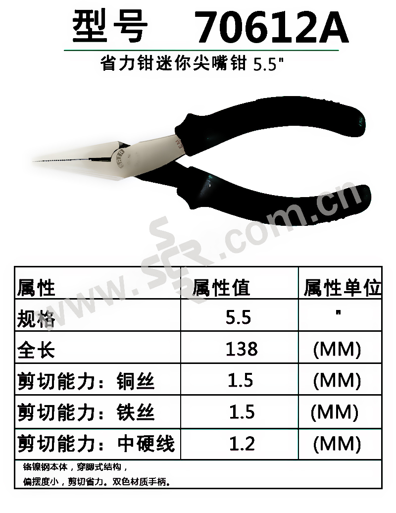 ·铬钒钢升级为铬镍钢,使用寿命较传统钳子延长30%。 ·手柄塑胶材料由单色沾塑升级为PP双色塑胶柄,设计动感,材料环保。 ·本体设计更符合流水线及高强度工作,减少手部疲劳感。 ·特殊涂抹防锈油工艺,符合更多场所使用。