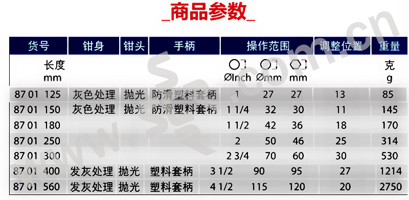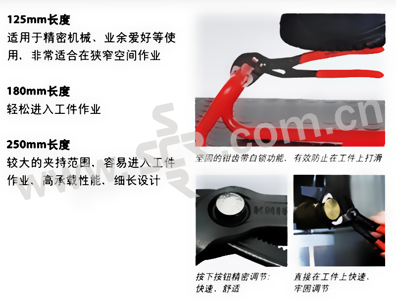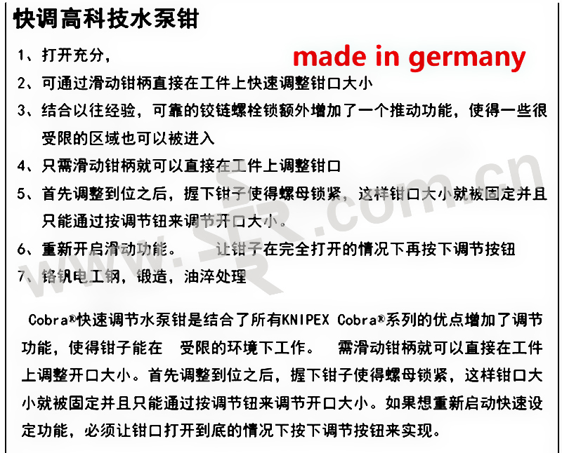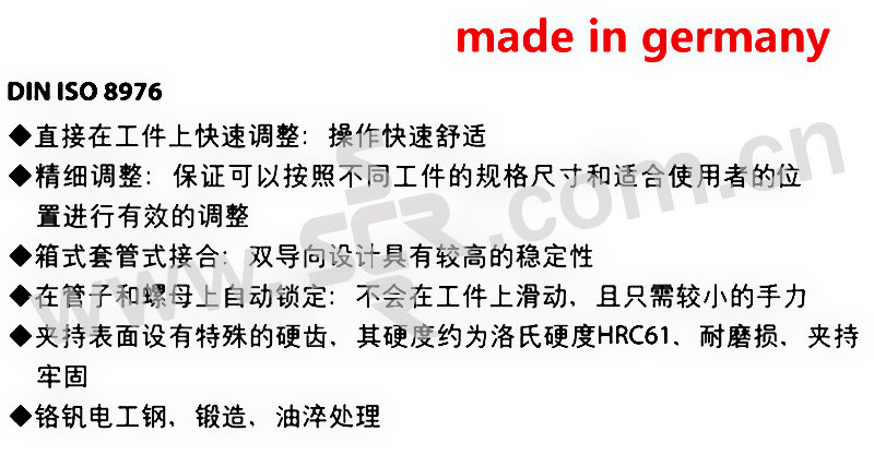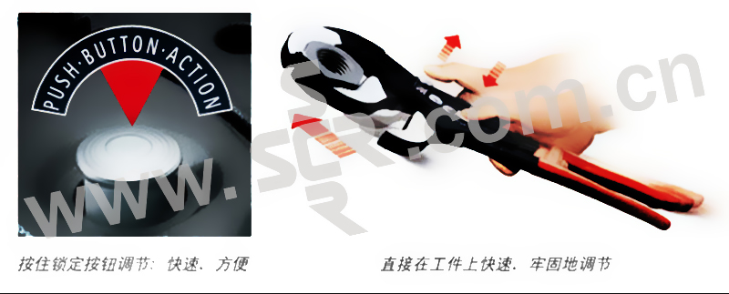 ·通过调节按钮可直接在工件上快速调节 ·精密调节:保证可以按照不同工件的规格尺寸和适合使用者的位置进行有效的调整。 ·在管子和螺母上自动锁定:不会在工件上滑动,且只需较小的手力。 ·夹持表面设有特殊的硬齿,其硬度约为HRC61,耐磨损,夹持牢固。 ·套管式铰链连接:双导向设计具有较高的稳定性。 ·可靠的铰链连接:不会打滑。 ·防夹手保护设计。 ·铬钒电工钢,锻造,油淬