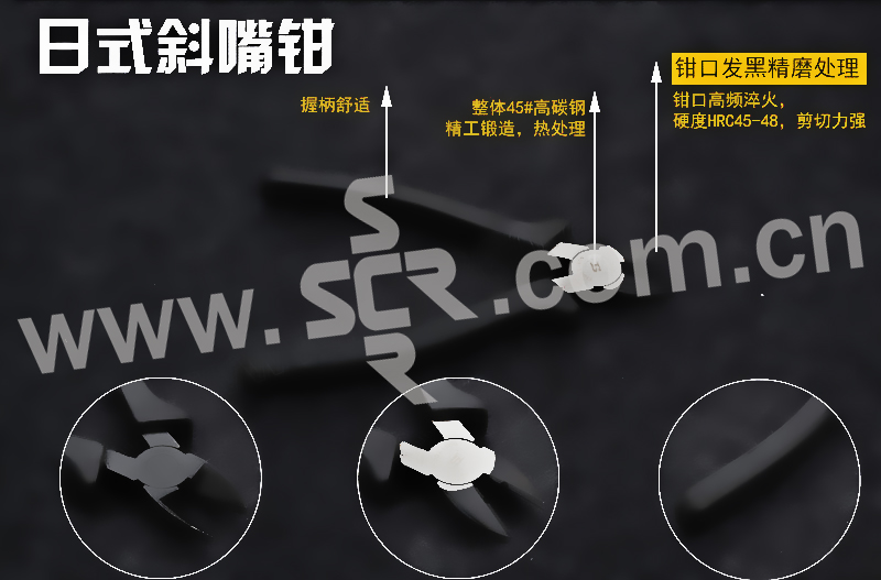 ·整体55#高碳钢精工锻造,热处理,钳口高频淬火,硬度45-48HRC,剪切力强,钳头发黑精磨处理