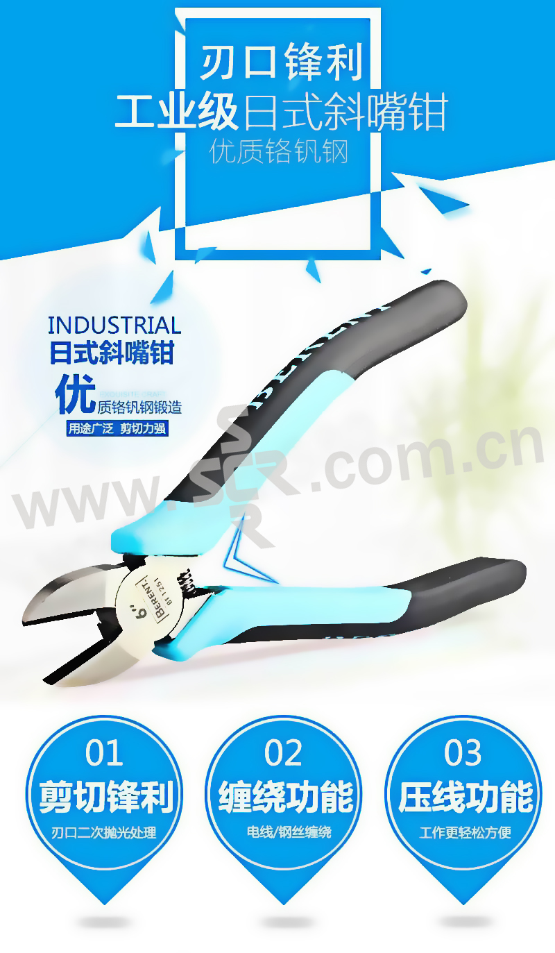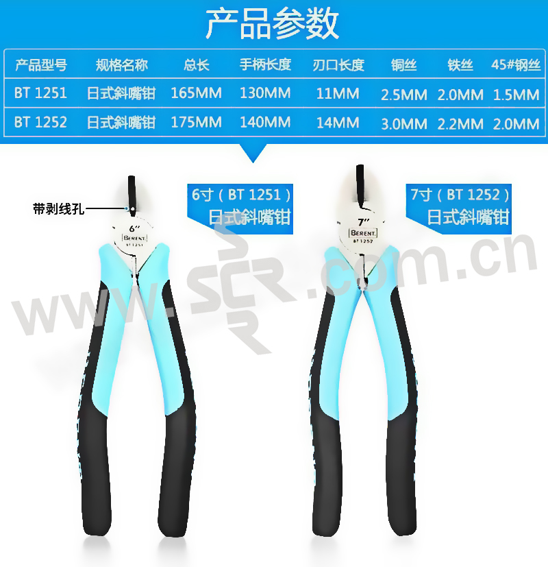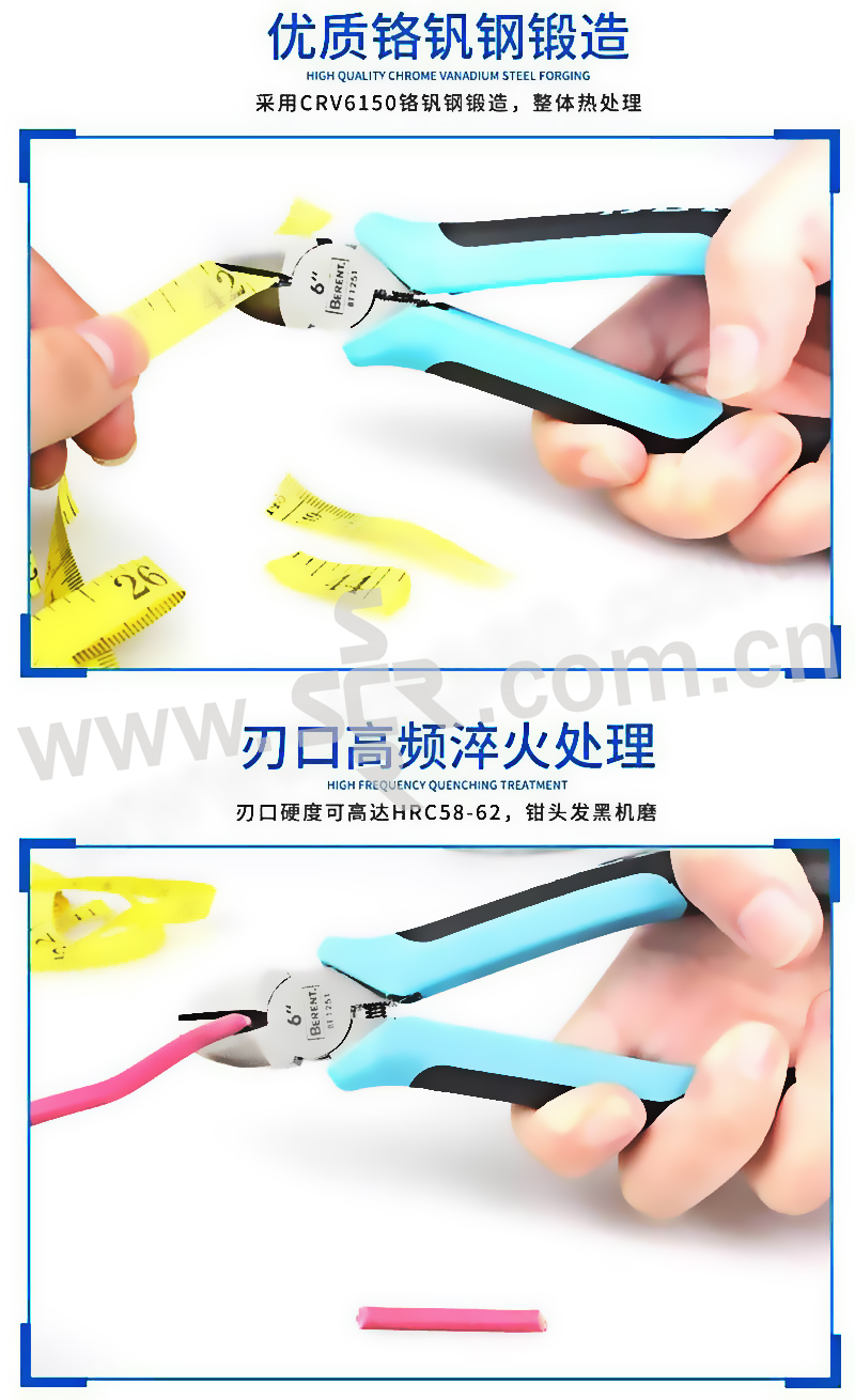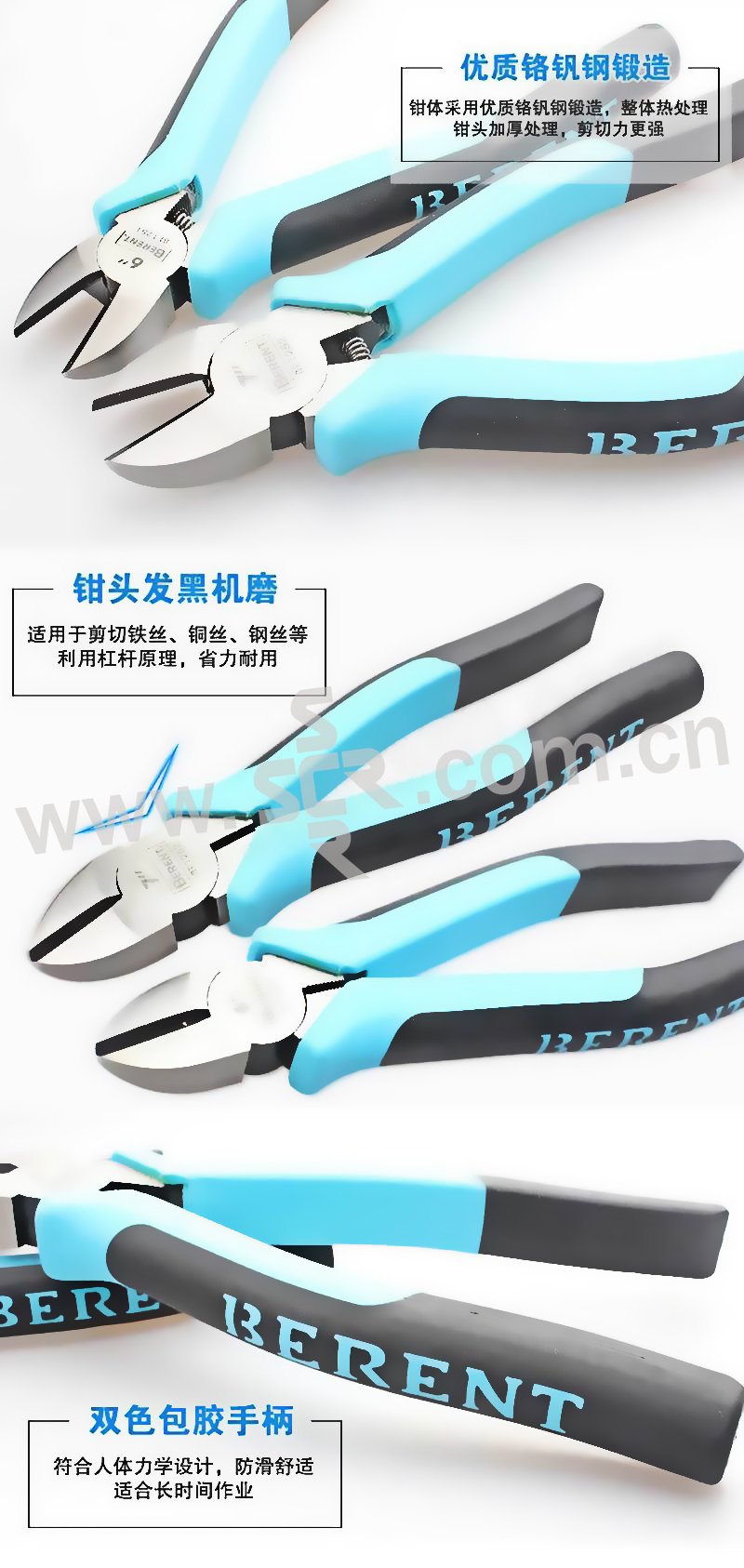·产品采用CRV6150铬钒钢锻造,整理热处理·刃口高频淬火,刃口硬度最高达HRC58-62,钳头发黑机磨·TPR双色手柄,美观耐用·剪切能力:铁丝2.0mm,铜丝3.0mm·采用标准:企业QB/T2441.1-2007