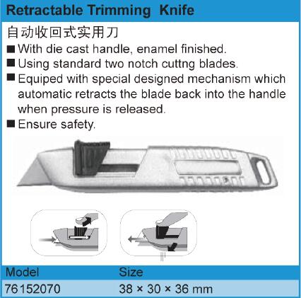 ·压铸手柄,珐琅成品。使用标准的两个切口切削刀片。配备特殊设计的机构自动将刀片收回到刀柄内。当压力释放时,确保安全。