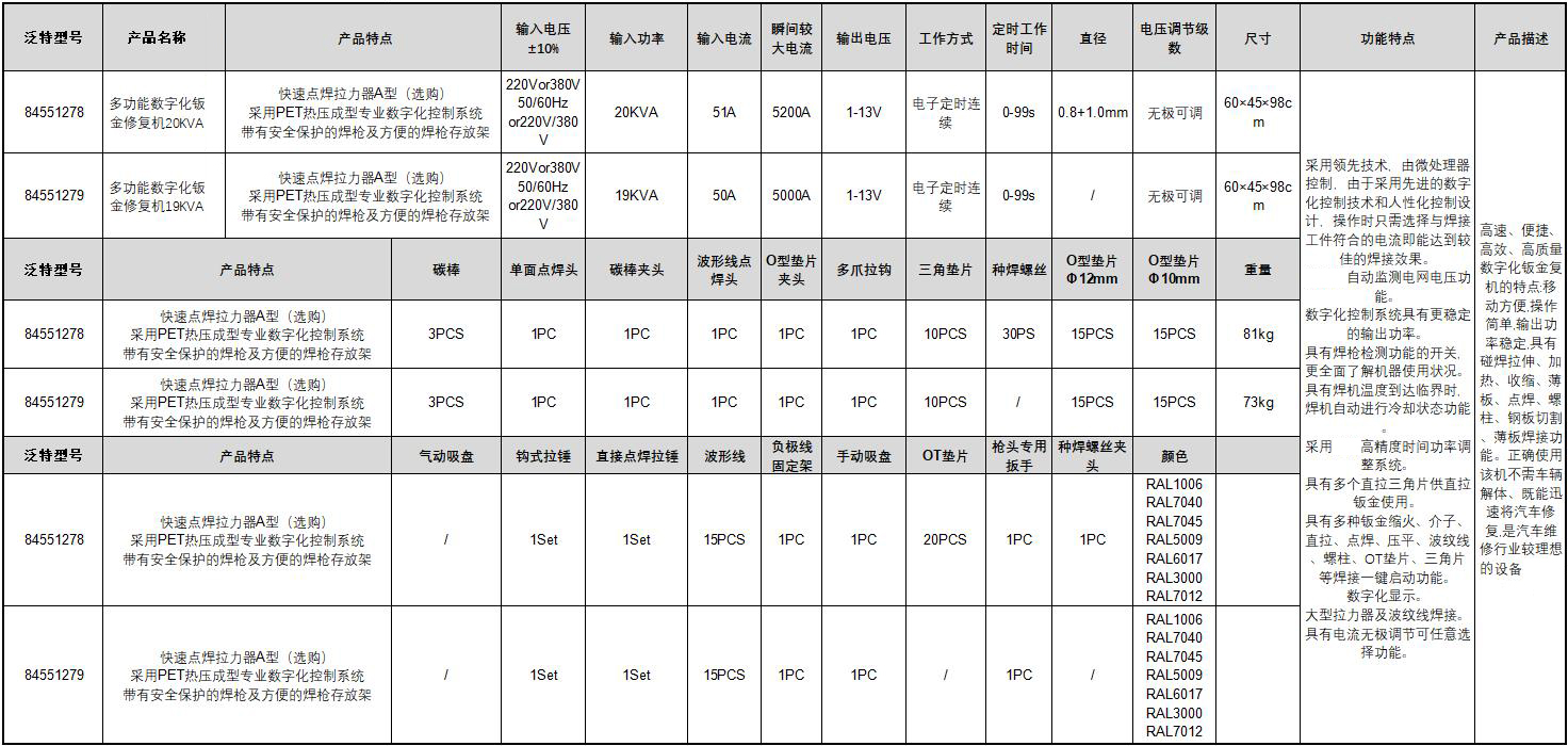 高速、便捷、高效、高质量 数字化钣金复机的特点:移动方便,操作简单,输出功率稳定,具有碰焊拉伸、加热、收缩、薄板、点焊、螺柱、钢板切割、薄板焊接功能。正确使用该机不需车辆解体、既能迅速将汽车修复,是汽车维修行业较理想的必备设备之一。