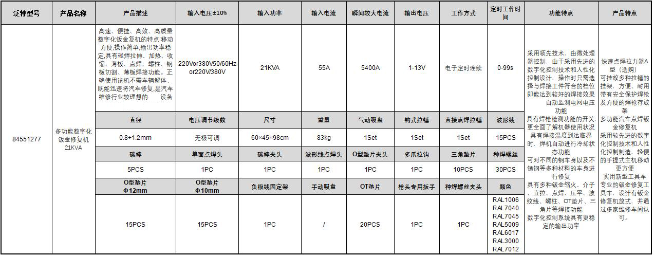 高速、便捷、高效、高质量 数字化钣金复机的特点:移动方便,操作简单,输出功率稳定,具有碰焊拉伸、加热、收缩、薄板、点焊、螺柱、钢板切割、薄板焊接功能。正确使用该机不需车辆解体、既能迅速将汽车修复,是汽车维修行业较理想的必备设备之一。