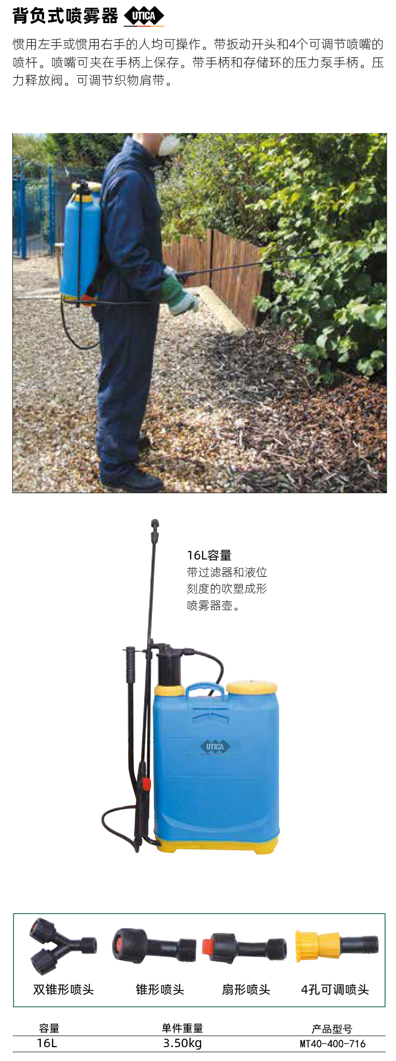 ·惯用左手或右手的人均可操作。带扳动开头和4个可调节喷嘴的喷杆。喷嘴可夹在手柄和储存环的压力泵手柄。压力释放阀。可调节织物肩带。