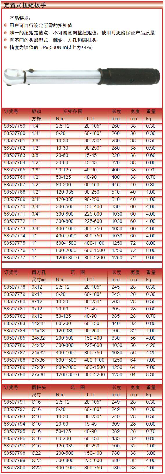 ·产品特点: ·用户可自行设定所需的扭矩值 ·唯一的扭矩定值点,不可随意调整扭矩值,使用时更能保证产品质量有不同的头部型式,棘轮、方孔和圆柱头 ·精度为读值的±3%(500N.m以上为±4%)