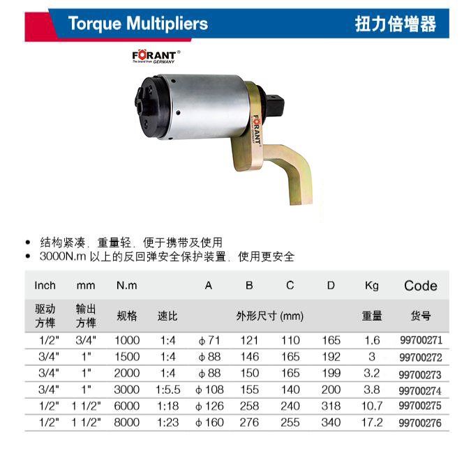 ·结构紧凑,重量轻,便于携带及使用,3000N.m 以上的反回弹安全保护装置,使用更安全