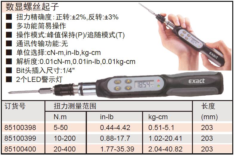 ·扭力度:正转:±2%,反转:±3% ·多功能简易操作 ·操作模式:峰值保持(P)/追随模式(T) ·通讯传输功能:无 ·单位选择:cN-m,in-lb,kg-cm ·解析度:0.01cN-m,0.01in-lb,0.01kg-cm ·Bit头插入尺寸:1/4" ·2个LED警示灯