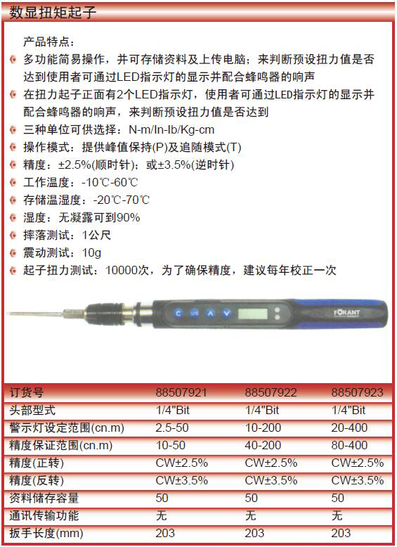 ·产品特点: ·多功能简易操作,并可存储资料及上传电脑;来判断预设扭力值是否达到使用者可通过LED指示灯的显示并配合蜂鸣器的响声 ·在扭力起子正面有2个LED指示灯,使用者可通过LED指示灯的显示并配合蜂鸣器的响声,来判断预设扭力值是否达到 ·三种单位可供选择:N-m/In-Ib/Kg-cm ·操作模式:提供峰值保持(P)及追随模式(T) ·精度:±2.5%(顺时针);或±3.5%(逆时针) ·工作温度:-10℃-60℃ ·存储温湿度:-20℃-70℃ ·湿度:无凝露可到90% ·摔落测试:1公尺 ·震动