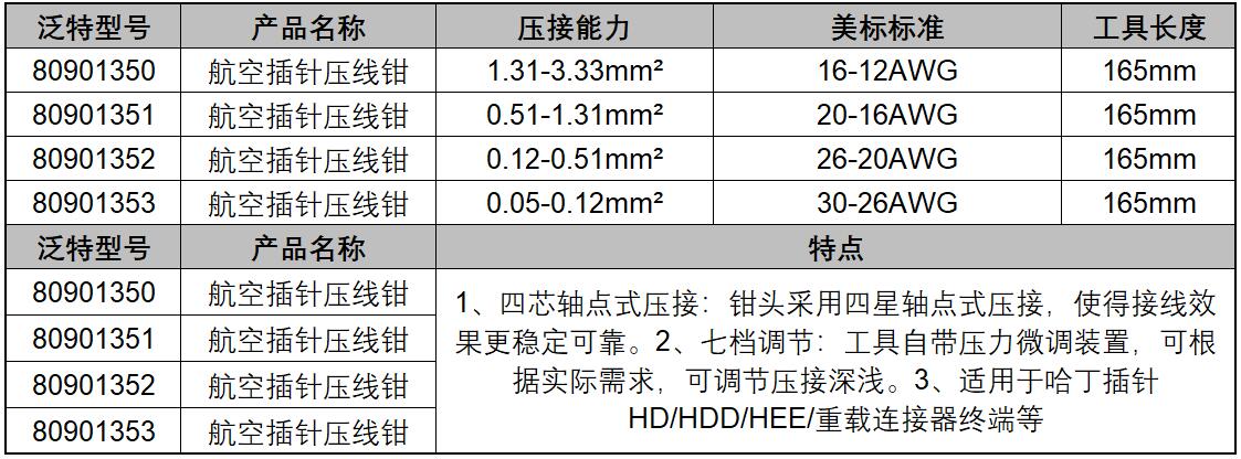 ·适用于德驰连接器、机加工端子、公母插针、车床件。 ·可调定位器,可根据端子长度进行压接位置的调节。 ·四芯轴点式压接,使得接线效果更稳定可靠。 ·七档调节,可根据实际需求,对压接力度进行控制。