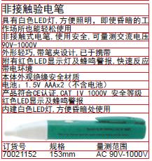 ·具有白色LED灯,方便照明,即使昏暗的工作场所也能轻松使用 ·非接触式电笔,使用安全,可量测交流电压90V-1000V ·外形轻巧,带笔夹设计,已于携带 ·附有红色LED显示灯及蜂鸣警报,快速反应 ·带电环境 ·本体外观绝缘安全材质 ·电池:1.5VAAA×2(不含电池) ·产品符合CE认证,CATIV1000V安全等级 ·红色LED显示及蜂鸣警报 ·内建白色LED灯,方便昏暗处使用