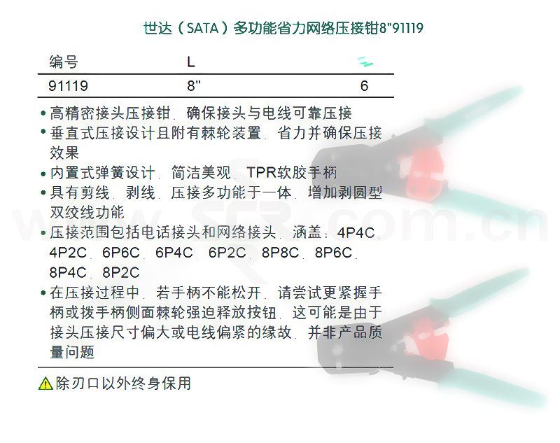 ·高精密接头压接钳,确保接头与电线可靠压接。 ·垂直式压接设计且附有棘轮装置,省力并确保压接效果。 ·内置式弹簧设计,简洁美观,TPR软胶手柄。 ·具有剪线,剥线,压接多功能于一体,增加剥圆型。 ·双绞线功能。 ·压接范围包括电话接头和网络接头,涵盖:4P4C,4P2C,6P6C,6P4C,6P2C,8P8C,8P6C,8P4C,8P2C。