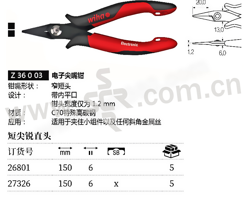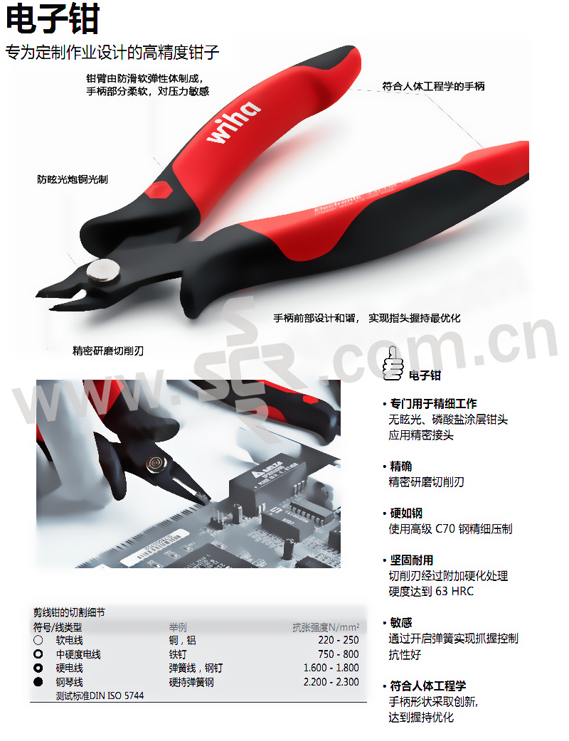 ·钳嘴形状:窄短头·设计:带内平口,钳头宽度仅为1.2mm·材质:C70特殊高碳钢