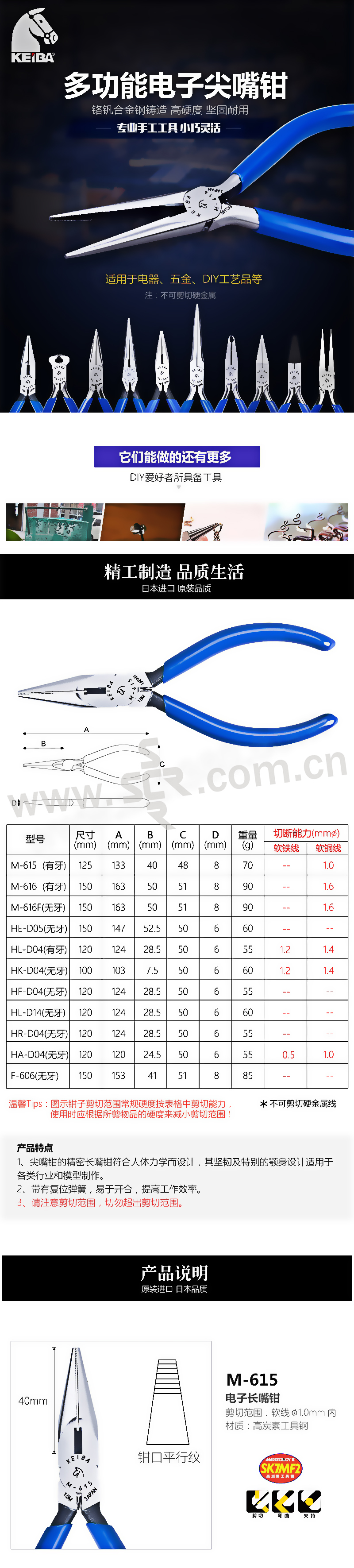 ·尖嘴钳的精密长嘴钳符合人体力学而设计,其坚韧及特别的颚身设计适用于各类行业和模型制作。